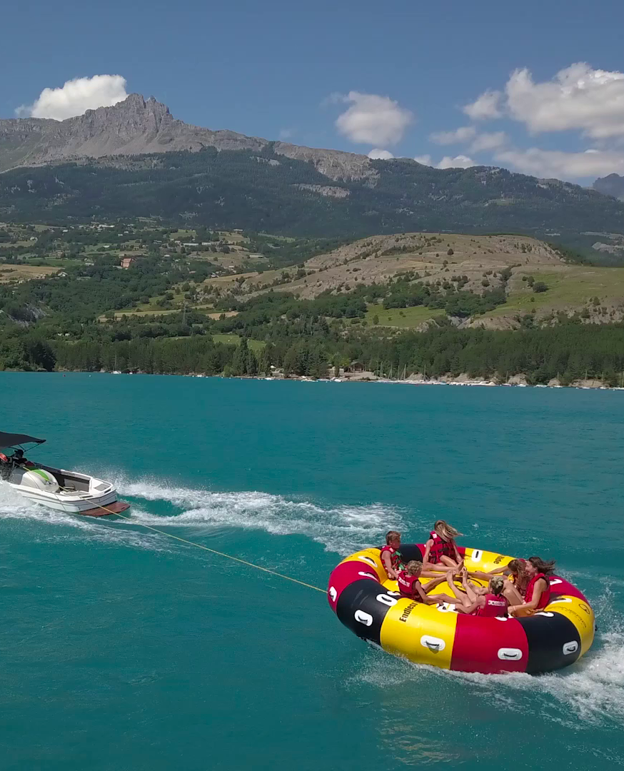 Pour votre sortie au lac de Serre-ponçon: l' incontournables bouées tractées! Rendez-vous plage du Bois Vieux si vous aimez la vitesse, les sensations fortes et les cascades, vous ne résisterez pas à l’appel de l’eau ! Venez passez un bon moment avec nous sur les engins gonflables !